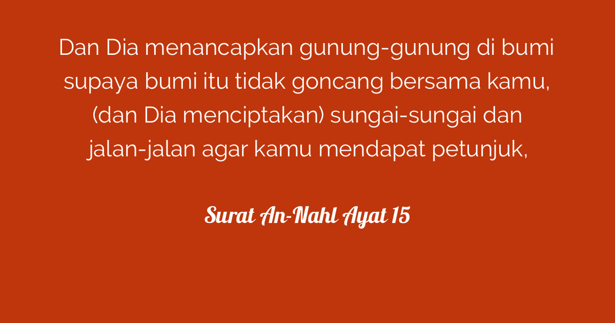 Baca surat an nahl ayat 15 Dan Dia menancapkan gunung-gunung di bumi supaya bumi itu tidak goncang bersama kamu dan Dia menciptakan sungai-sungai dan jalan-jalan agar kamu mendapat petunjuk Quran Surat An-Nahl Ayat 15. Quran Dictionary Graphs and pie-charts Manuscripts and Inscriptions Tafsir Zone and much more. Listen Surah Nahl Audio mp3. Pelajari jugasurat dan surat an nahl ayat 15 Quran Wiki is a repository for the best available data for every Surah and Ayat.